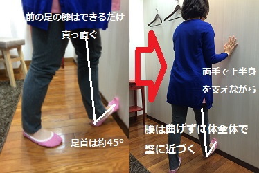 まずはあせらずにふくらはぎのストレッチから始めたらいいでしょう。これは壁や柱を利用して両腕をまっすぐ前方に伸ばし、壁に手のひらを付けて立った姿勢で始める体操で、そのまま壁に近づいて肘を曲げ、更に右足の踵を近づけて足の裏の上を壁につけ、膝はまっすぐ伸ばした状態で息を吐き、そのまま身体を壁に近づけて約20秒間姿勢を維持します。反対側も同様に行います。